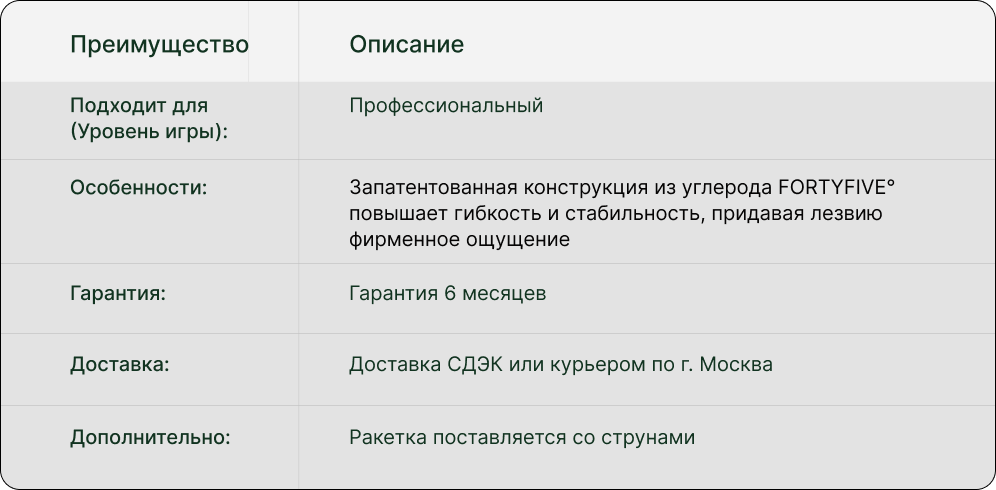 Имея почти 20 лет доминирования на теннисном корте, производительные ракетки Wilson Blade по-прежнему остаются предпочтительным выбором для заядлых конкурентов, ищущих максимальный контроль, ощущение и стабильность. Blade 100 v9 привлечет внимание как поразительной отделкой Emerald Night, так и высокой настройкой производительностью. Запатентованная конструкция из углерода FORTYFIVE° повышает гибкость и стабильность, придавая лезвию фирменное ощущение. Его немного более тяжелая рама и открытый рисунок струн 16x19 помогают продвинутым игрокам генерировать всю необходимую им мощность, обеспечивая при этом готовый доступ к разрушительному вращению.