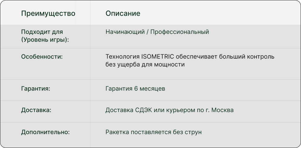 Конструкция ракетки включает технологию Isometric, что обеспечивает более точные удары.