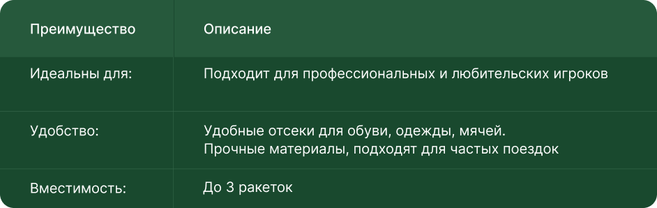 В основном отделении на молнии размещается до трех ракеток, а специальная внешняя защита ручки предотвращает повреждения. Задний отсек с усиленной конструкцией предназначен для ноутбука или планшета, а боковой карман идеально подходит для мелочей.