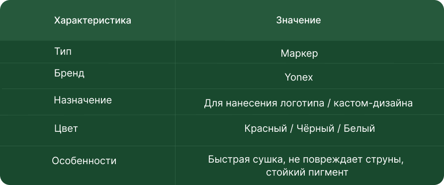 Добавьте индивидуальности и фирменного стиля своей ракетке. Маркеры для струн позволяют легко нанести логотип любимого бренда или создать уникальный визуальный образ на струнах. Маркеры на водной основе или с быстрой сушкой обеспечивают стойкий цвет, не повреждая струны.