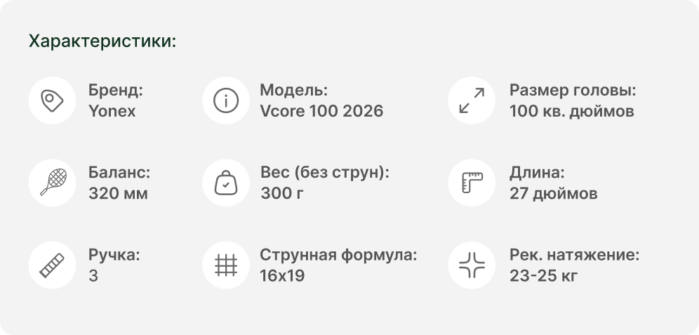 Yonex Vcore 100 создана для универсальных игроков среднего и продвинутого уровня, которые хотят вывести свое мастерство на новый уровень. Независимо от вашего стиля, техники удара или скорости замаха, Vcore 100 раскрывает безграничный игровой потенциал, помогая доминировать на корте в любых ситуациях.