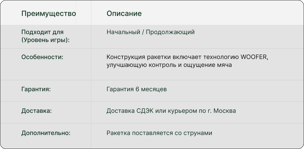 Модель отличается лёгким весом, графитовой конструкцией и балансом 340 мм. Подходит для игры на любом типе покрытия. Конструкция ракетки включает технологию WOOFER, улучшающую контроль и ощущение мяча.