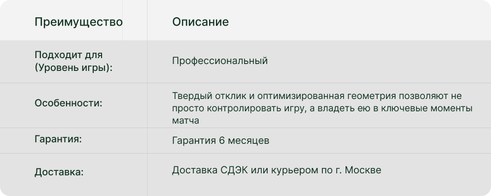 Технология PrismLock с треугольной структурой создает исключительную жесткость и стабильность. Карбон X-Tend 3K и ядро Multieva обеспечивают четкую передачу энергии, а текстура 3D Grain усиливает контроль над мячом.