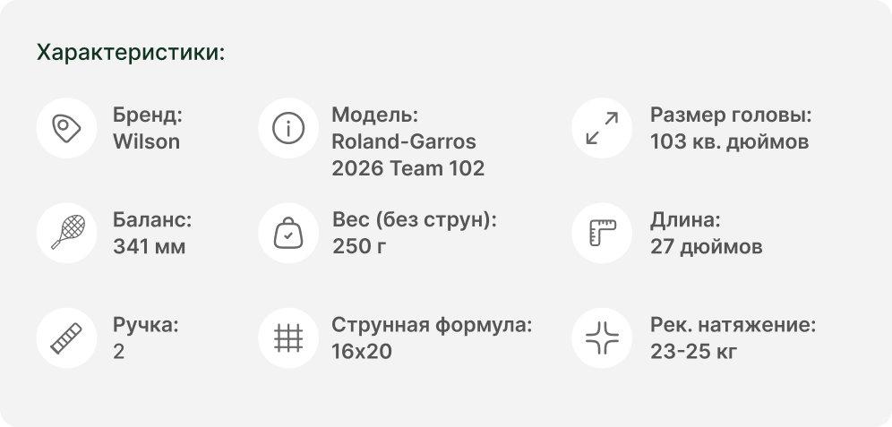 Вдохновленная стилем и элегантностью легендарного турнира, новая ракетка Wilson Roland-Garros 2026 Team 102 создана для рекреационных игроков, которые хотят получать максимум от игры. Сверхлегкая рама делает эту модель невероятно маневренной, позволяя быстро реагировать и выполнять молниеносные удары. Дизайн в духе Roland Garros добавляет уверенности и стиля на любом корте.