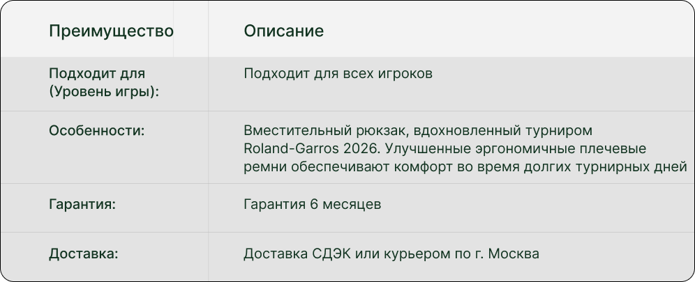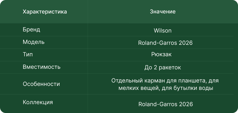 Рюкзак Wilson Roland-Garros 2026 воплощает культуру и эстетику самого культового теннисного турнира мира. Эксклюзивные узоры и дизайнерские детали, вдохновленные легендарным грунтовым чемпионатом, создают уникальный стиль, который вы не найдете больше нигде. Это выбор игроков, для которых теннис — не просто спорт, а образ жизни.