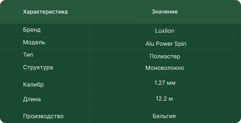Моноволокно диаметром 1.27 мм сочетает жесткость для энергии отскока с исключительным чувством мяча. Катушка длиной 12.2 метров рассчитана на профессиональную натяжку.