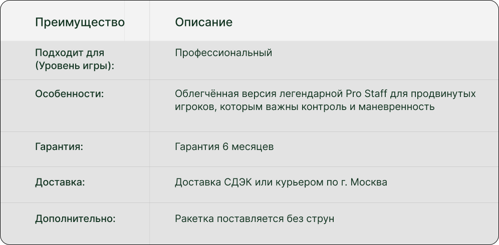 Увеличенное время контакта усиливает ощущение мяча и контроль, при этом сохраняется фирменная стабильность и характерное чувство Pro Staff. Классический дизайн подчёркивает наследие серии, делая Pro Staff 97L Classic отличным выбором для игроков, которым важны лёгкость, манёвренность и точность без потери легендарных игровых ощущений.