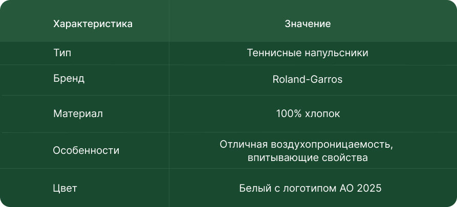 Модель выполнена из 100% хлопка, отличается отличной воздухопроницаемостью, лаконичным дизайном с логотипом Roland-Garros. В комплекте два напульсника. Идеально подходит для любителей и профессионалов всех уровней.