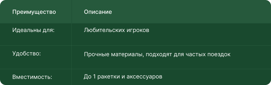 Модель вмещает до 1 ракетки, а также небольшие аксессуары. Изготовлена из влагонепроницаемых материалов, которые обеспечивают прочность, долговечность и устойчивость к внешним условиям. Наплечный ремень — всё продумано для комфорта в движении.