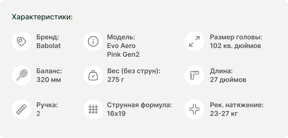 Вес ракетки без струн составляет 275 г, а в снаряженном состоянии — около 290 г, что обеспечивает идеальный баланс маневренности и стабильности. Баланс 320 мм смещен в ручку (Head Light), что гарантирует легкость управления у сетки и быструю реакцию. Ракетка Babolat Evo Aero Pink Gen2 Strung — ваш ключ к развитию мощной и стильной игры на корте.