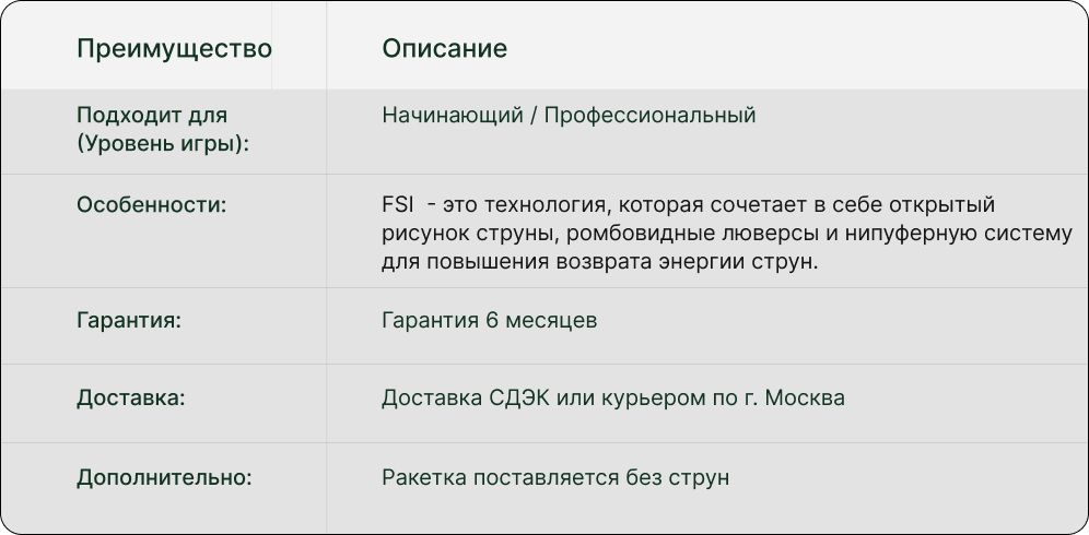 Голова 100 дюймов, баланс 320 мм и вес 300 грамм обеспечивают отличное сочетание контроля и силы. Открытая струнная формула 16/19 позволяет эффективно генерировать вращение и удерживать мяч под контролем в самых динамичных розыгрышах. Ракетка изготовлена из графита, что придаёт ей лёгкость и прочность.