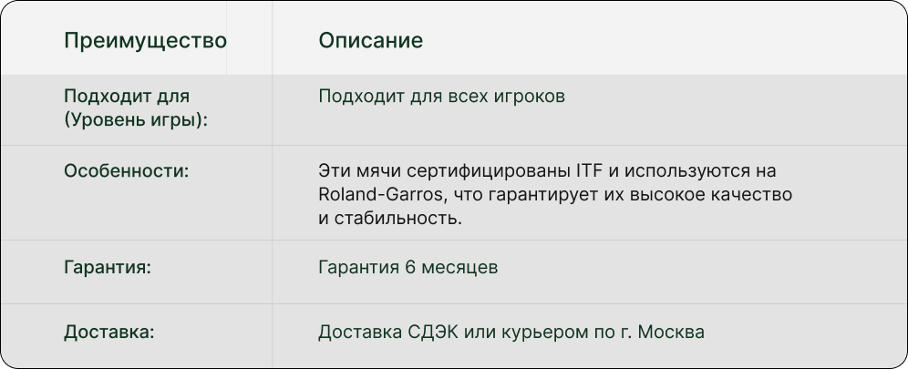 Модель подходит как для грунтовых, так и для твердых кортов. Уникальный состав фетра минимизирует впитывание влаги и грязи, обеспечивая стабильный отскок даже при интенсивной игре. Прочный резиновый сердечник помогает мячу сохранять свои игровые свойства в течение длительного времени.